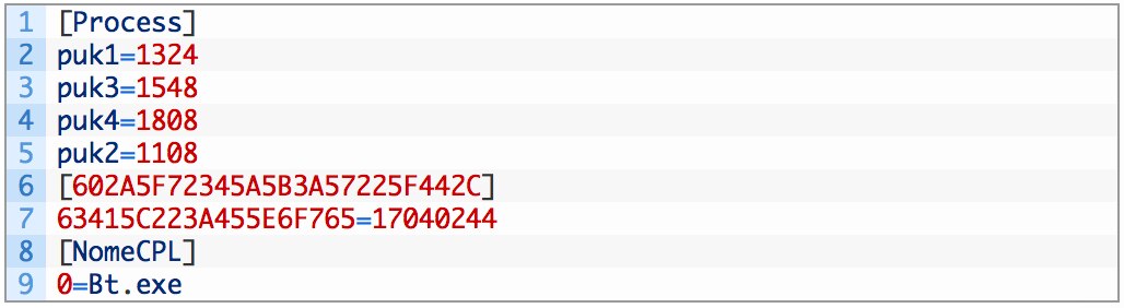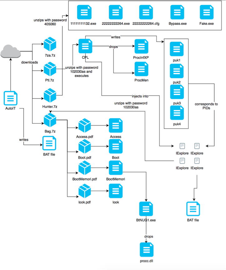 AutoITスクリプトが必要なファイルをすべて目的の場所に書き込み、CPLファイルを実行し、自分自身を削除すると、制御がこのCPLファイルに渡されます。CPLファイルは、まず予めディスクに書き込んでおいた偽のPDFファイルを探し出そうとします。見つかった場合、CPLファイルはこれらの偽のPDF文書をパスワード「405060」により解凍します。Access.pdf、look.pdf、Boot.pdfのバイナリ コンテンツの目的は不明です。一方、BootMemori.pdfは解凍され、その内部の実行可能ファイルが%APP_DATA%\microsoft\windows\templatesの下に、「Bt」で始まることが多いランダムなファイル名で置かれます。CPLファイルはProcInfXPという名前のファイルをユーザーのtempフォルダーに書き込みます。このファイルの内容(コメント付き)は以下のとおりです。