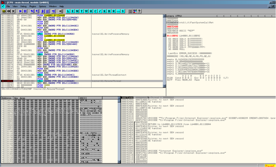 その後、CPLファイルは2015年9月にコンパイルされた実行可能なMZPをサスペンド状態のIExploreに埋め込みます。
