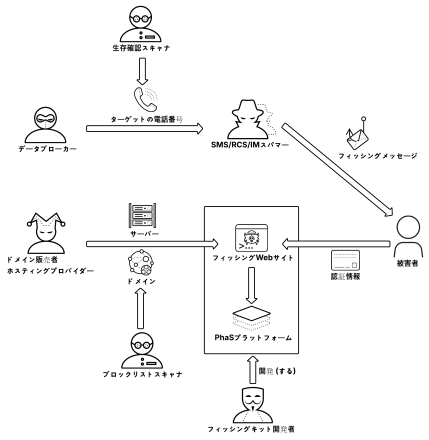 - SMS/RCS/IMスパマー:フィッシングメッセージを大規模に配信し、被害者をフィッシングWebサイトに誘導