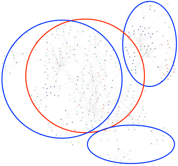 2月中旬から、Unit 42のリサーチャーは、犯罪と標的型攻撃にGorgon Groupが利用するインフラストラクチャの大部分を共有しているアクティブな攻撃キャンペーンを追跡しました。下図9で、赤は標的型攻撃キャンペーンに関連する標的のIPアドレス、マルウェア、登録情報、およびドメインを示し、青は犯罪的攻撃のIPアドレス、使用マルウェア、登録情報、およびドメインを示します。