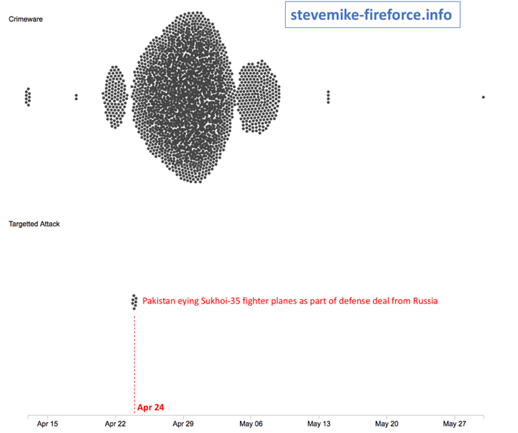 4月24日を観察すると興味深い事実を発見できます。このドメインは、世界のいくつかの政府機関を狙って標的型攻撃を配信していて、その最中にマルスパム活動の配信にも使用されています。この標的型攻撃に使用されていた件名は、「Pakistan eying Sukhoi-35 figther planes as part of defense deal from Rusia」でした。