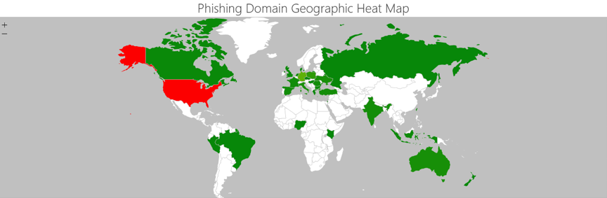 2018年の第1四半期には、262件の固有ドメインから4,213件のURLがフィッシング攻撃で使用されました。平均すると、1ドメイン当たり16件の異なるフィッシングURLを提供していることになります。次のヒート マップは、これらの262件のドメインの地理的分布を示しています。