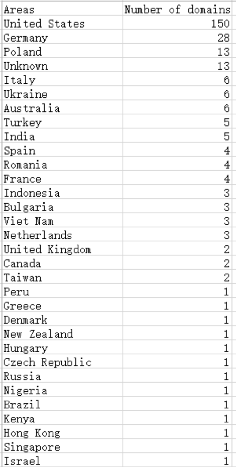 これらのフィッシング ドメインの半数以上が、米国でホストされていました。2番目以降に多い国で観測されたドメイン数は米国に比べて少数でした。2番目のドイツは28件、3番目のポーランドは13件でした(図2参照)。