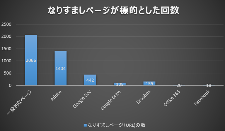 汎用のフィッシング テンプレート以外では、Adobe顧客を標的にしたフィッシングのなりすましページのURLが1,404件、DropBox顧客を標的にしたURLが155件、Facebook ユーザーを標的にしたURLが18件、Google Docユーザーを標的にしたURLが442件、Google Driveユーザーを標的にしたURLが108件、Office 365顧客を標的にしたURLが20件ありました。図4は、標的別にフィッシングURLの分布を示した棒グラフです。この棒グラフから、合計4,213件のURLのうち、ほぼ50%を汎用のフィッシングURLが占めていることがわかります。次に、AdobeおよびGoogleの顧客を標的にしたURLがそれぞれ33%、13%と続いています。これら上位の3つ以外では、少数ながらOffice 365およびFacebookの顧客を標的にしたURLがあります。