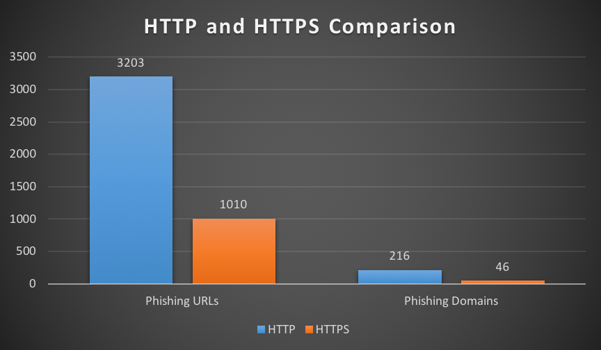 HTTPSを使用したフィッシングURLは、識別がより困難です。そのため、さらに労力を割いて、それらの識別と分析に取り組みました。4,213件のフィッシングURLのうち、1,010件が46件の固有ドメインからのHTTPS URLです。平均すると、1ドメイン当たり21件のフィッシングURLを提供していることになります。図5は、HTTPとHTTPSのフィッシングURLおよびドメインの比較です。