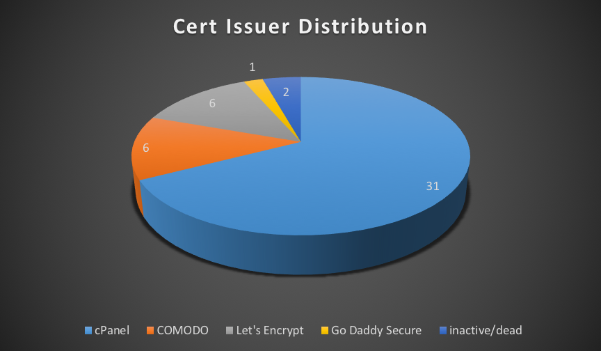 弊社は、46件のドメインの証明書発行者も調査しました。「cPanel」が31件のフィッシングドメインの証明書を発行し、「COMODO」および「Let's Encrypt」がそれぞれ6件の異なるフィッシング ドメインの証明書を、「Go Daddy Secure」が1件の証明書を発行していました。2件のドメインはすでに使用されていませんでした(図6参照)。