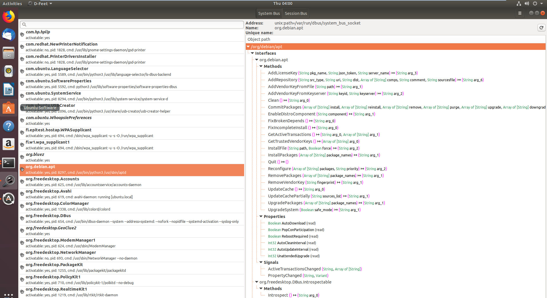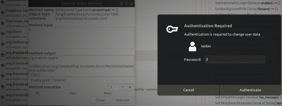 また、サービスによっては、org.freedeskto.PolicyKit1 という名前の別の D-Bus サービスに問い合わせを行い、ユーザーに特定の操作の実行を許可するかどうかを確認するものがあります。 この org.freedeskto.PolicyKit1 (polkit) サービスについては後でまた取り上げます。
