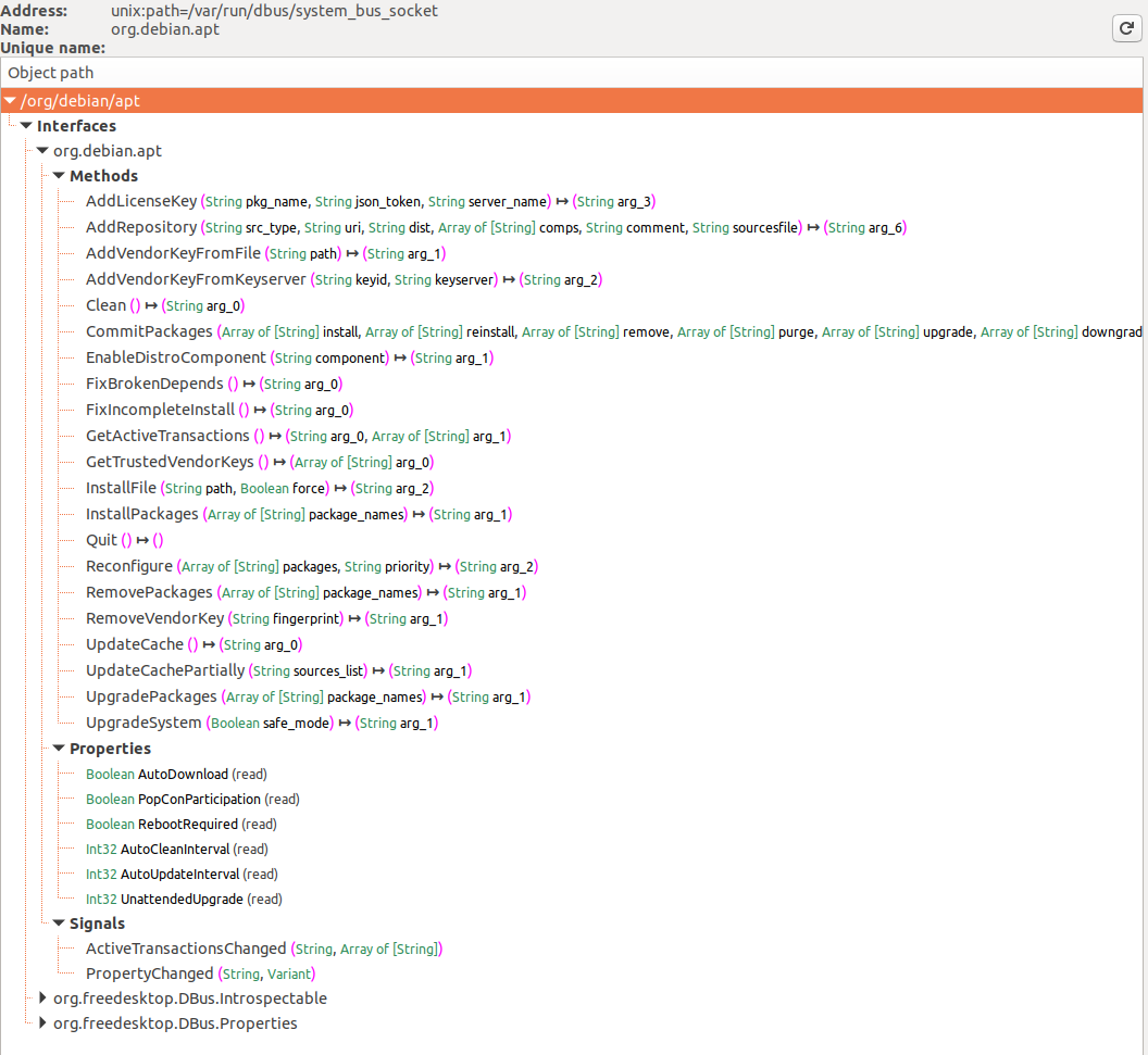 D-Feet は優れたツールで、今回の調査に不可欠なツールであることが分かりました。図 1 の左ペインには、D-Bus デーモンのシステム バスに登録されているさまざまなサービスがすべて表示されています(上部にある [System Bus] の選択ボタンに注目してください)。org.debin.apt を選択すると、D-Feet は自動的に当該サービスで利用可能なすべてのオブジェクトを問い合わせます。特定オブジェクトを選択すれば、すべてのインターフェイス セットと、それぞれのセットに付随するメソッドのプロパティとシグナルが一覧表示されます(図 2 参照)。ここでは、各 IPC に公開されているメソッドのシグネチャも合わせて取得している点に着目してください。