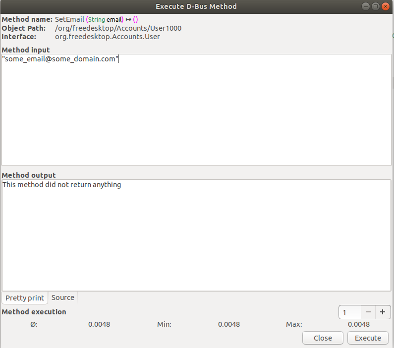 D-Bus インターフェースとの通信にあたって 2 つのツールを利用しました。1 つは gdbus という CLI ツールで、これを使えばスクリプト内から D-Bus に公開されているメソッドを簡単に呼び出すことができます。もう 1 つは D-Feet という Python ベースの GUI ツールで、各バスで利用可能なサービスを列挙し、各サービスに含まれるオブジェクトを確認するのに役立ちます。