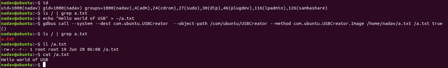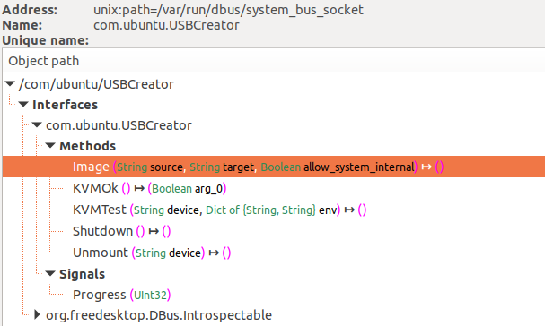 脆弱性の見つかったサービスは com.ubuntu.USBCreator です。/com/ubuntu/USBCreator で表されるオブジェクトの下に Image メソッドがあります。このメソッドは、Ubuntu の USB Creator ツールが内部的に利用するものです。