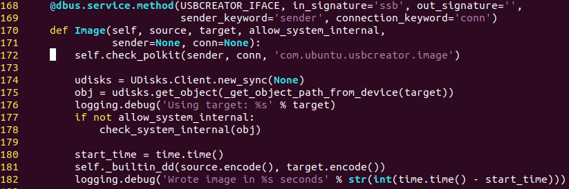 このサービスは Python で実装されているので、関連するソースコードを簡単に調べられます。まず、このメソッドと対話するために必要な特権はcom.ubuntu.usbcreator.image であることが分かります。ソースコードからは、要求しているユーザーにこの要求が許可されているかどうかについて、polkit に問い合わせが行われることが分かります(172行目)。