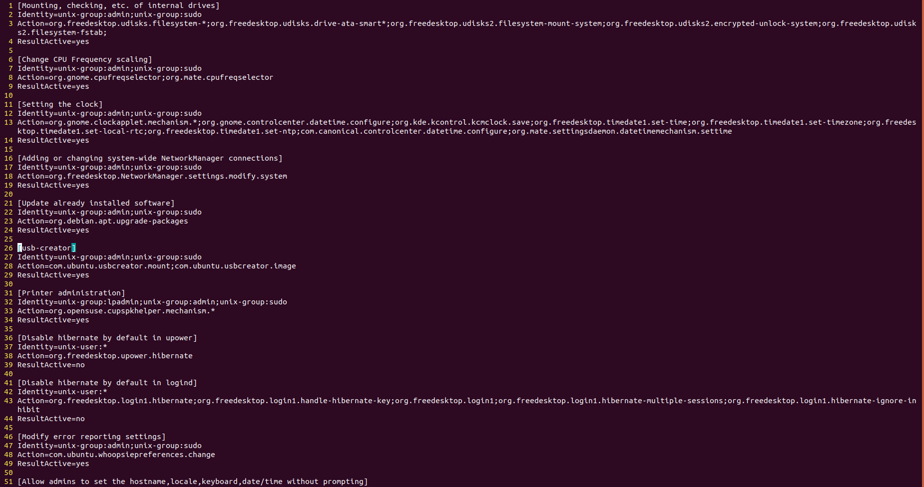 図 9 26 行目から始まるセクションで com.ubuntu.usbcreator.image メソッドへのアクセスを許可するグループが指定されている