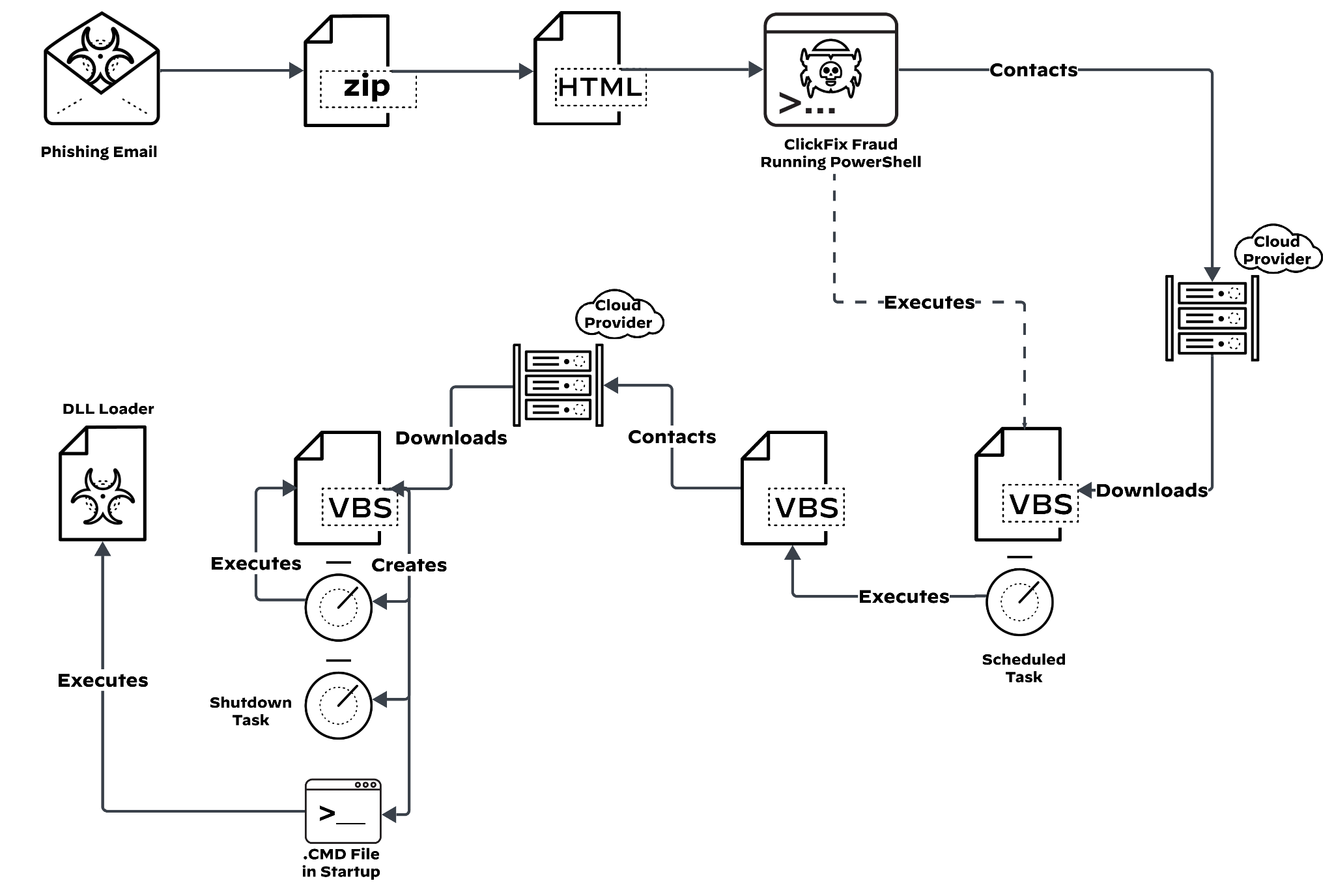 The victim’s execution of the malicious PowerShell command downloads and executes an obfuscated Visual Basic Script (VBS) file, which is part of this campaign. Figure 1 depicts the infection chain below.