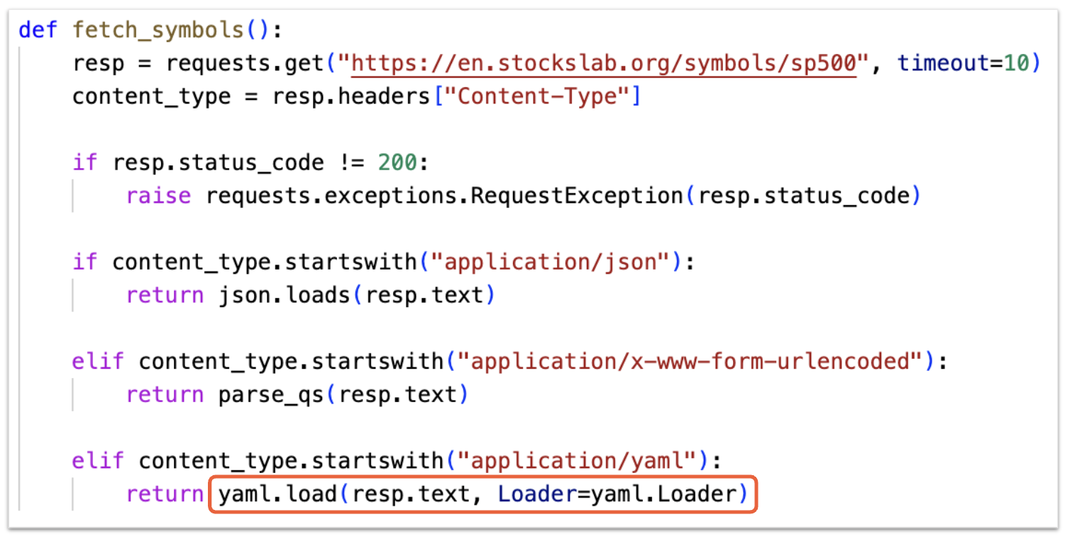 If the response indicates YAML data (application/yaml), the code uses the yaml.load() function from the PyYAML library to parse the data. This function is inherently unsafe and the PyYAML documentation explicitly recommends yaml.safe_load() for untrusted input.