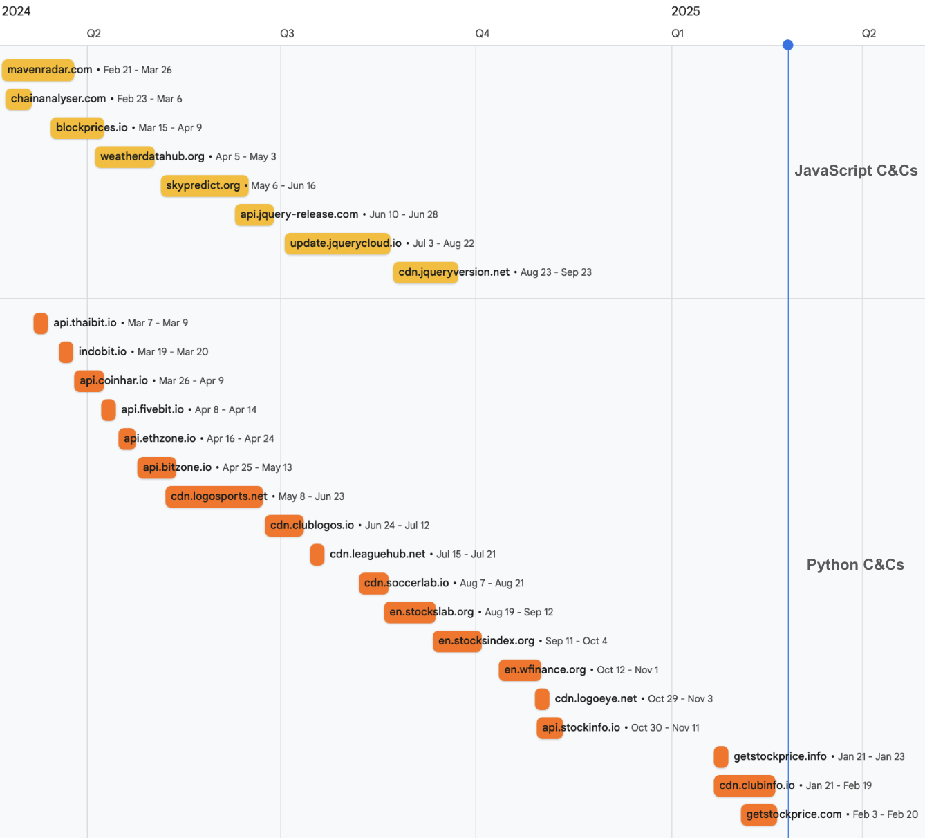 The timeline below in Figure 9 details the C2 infrastructure used in this campaign from February 2024-February 2025, grouped by the type of repository served (JavaScript or Python).